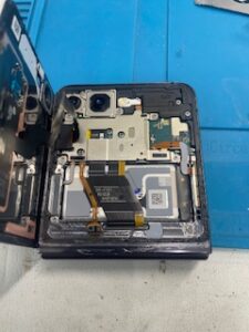 写真のように内部をしっかり開いて、一つひとつ状態を確認しながら作業しています。Z Flipシリーズは特有の故障も多いですが、当店ではこれまでの経験を活かして丁寧に対応しています。